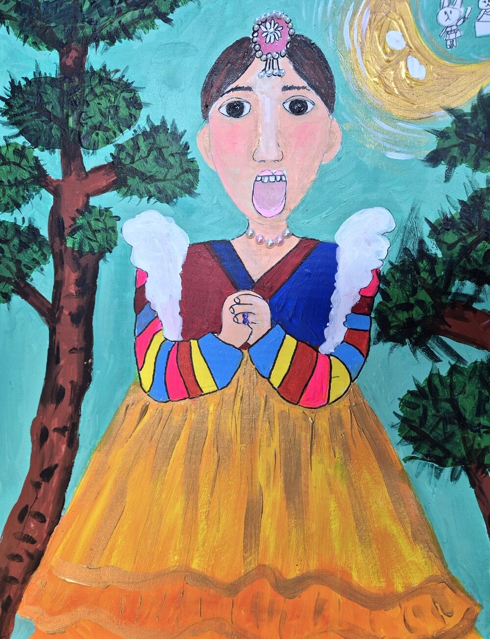 정채이 작가의 ‘춘향의 사랑’ 작품은 춘향전의 주인공이 몽룡을 향한 사랑을 노래하는 감동적인 작품입니다. 작가는 주요 장면을 현대적으로 재해석해 관람객에게 전통 사랑 이야기를 제공합니다. 인물의 표정과 몸짓은 사랑의 순간을 전달하며, 배경의 한국 소나무와 방아 찧는 토끼는 고전과 전통을 상징합니다.