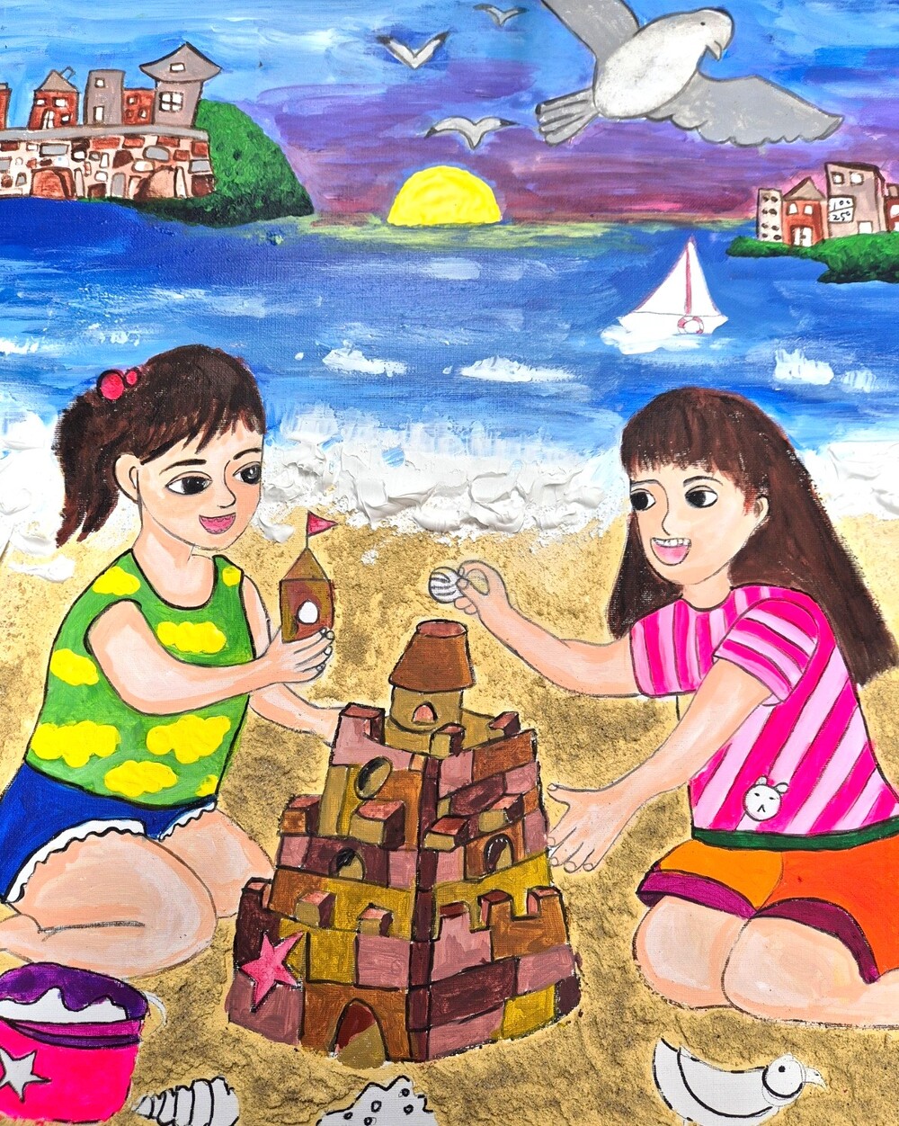 조다윤 작가의 ‘바다의 추억’은 해변에서 언니와 모래성을 만드는 어린 아이의 모습을 담은 작품입니다. 두 사람의 웃음은 관람객의 공감을 불러일으키며, 배경의 바다와 하늘은 자유와 희망을 상징합니다. 작가는 색채와 구도로 가족 간의 유대감과 즐거운 놀이를 표현하며, 밝고 선명한 색채는 어린 시절의 행복한 추억을 떠올리게 합니다.