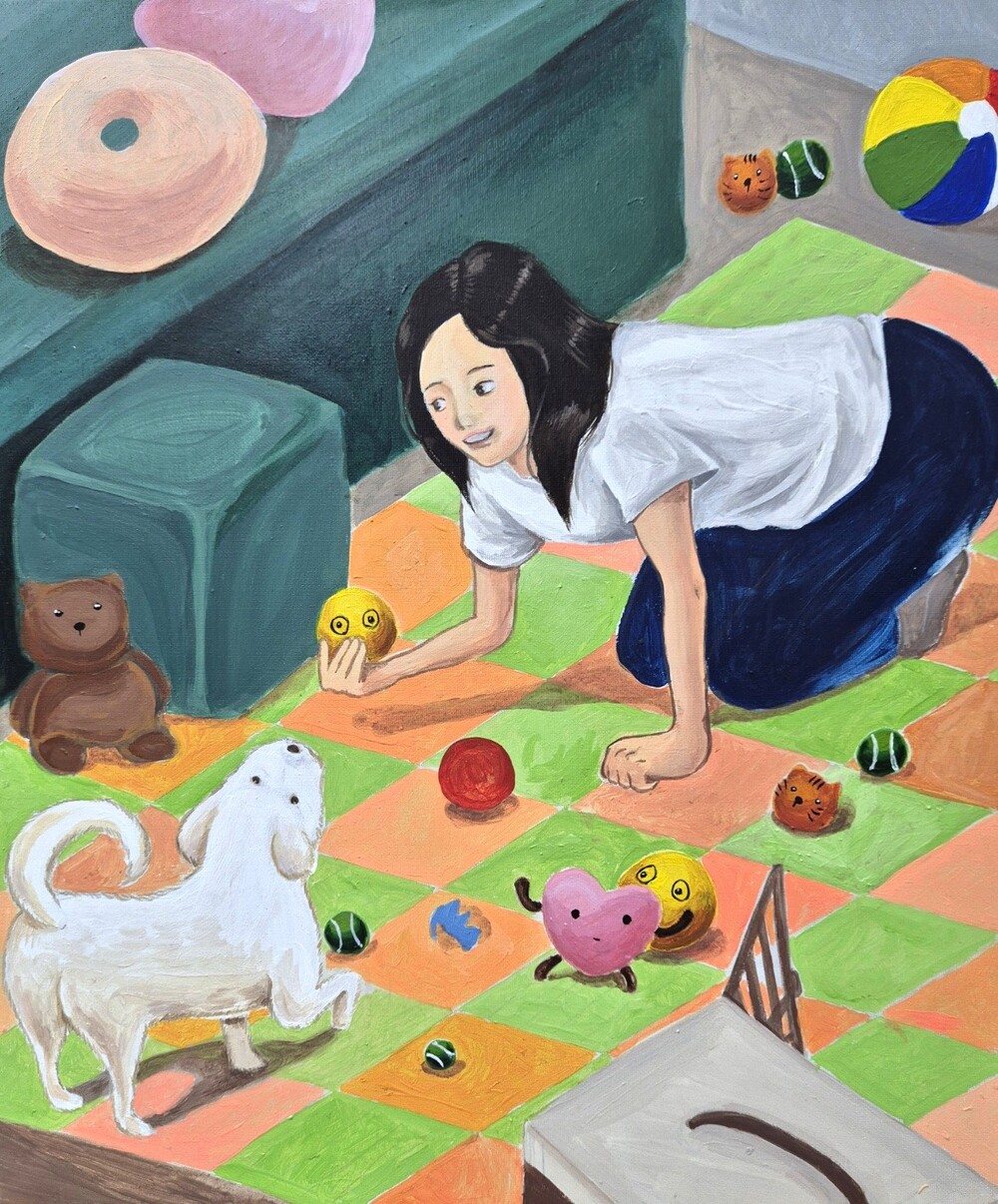 황서정 작가의 ‘반려견 강아지 만두와 함께’ 작품은 반려견과의 사랑을 담은 감성적인 작품입니다. 작품은 만두와 함께 있는 사람을 중심으로 부드럽고 따뜻한 색채로 동물에 대한 존중과 사랑을 표현합니다. 작가는 동물과의 교감을 통해서 소중한 사랑과 우정을 느낄 수 있다는 메세지를 전합니다.