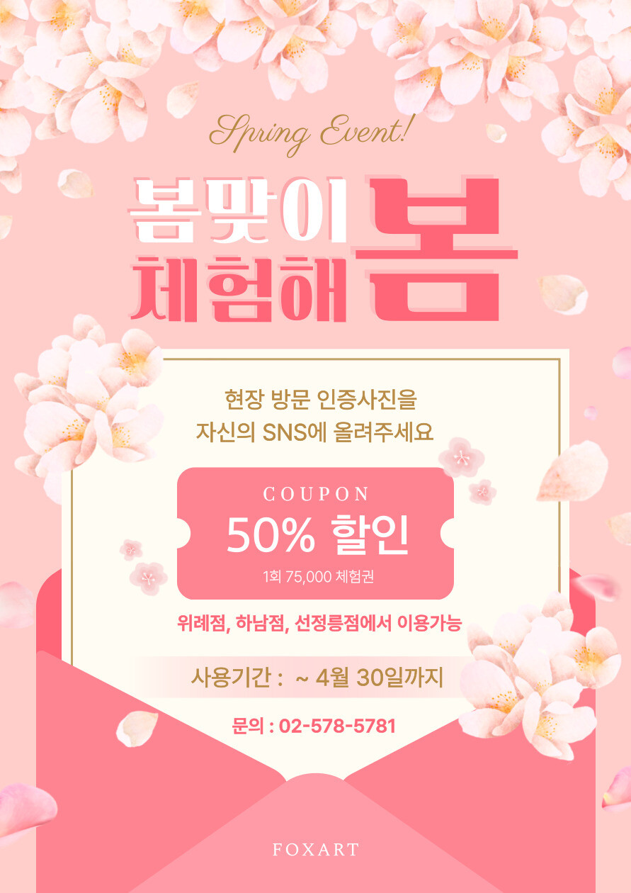 ■ 이 용 방 법 : 현장 인증사진을 자신의 SNS(인스타 or 페이스북 or 블로그) 에 올린 후 체험 수업 예약하기 (위례점, 하남점, 선정릉점 중 택1)